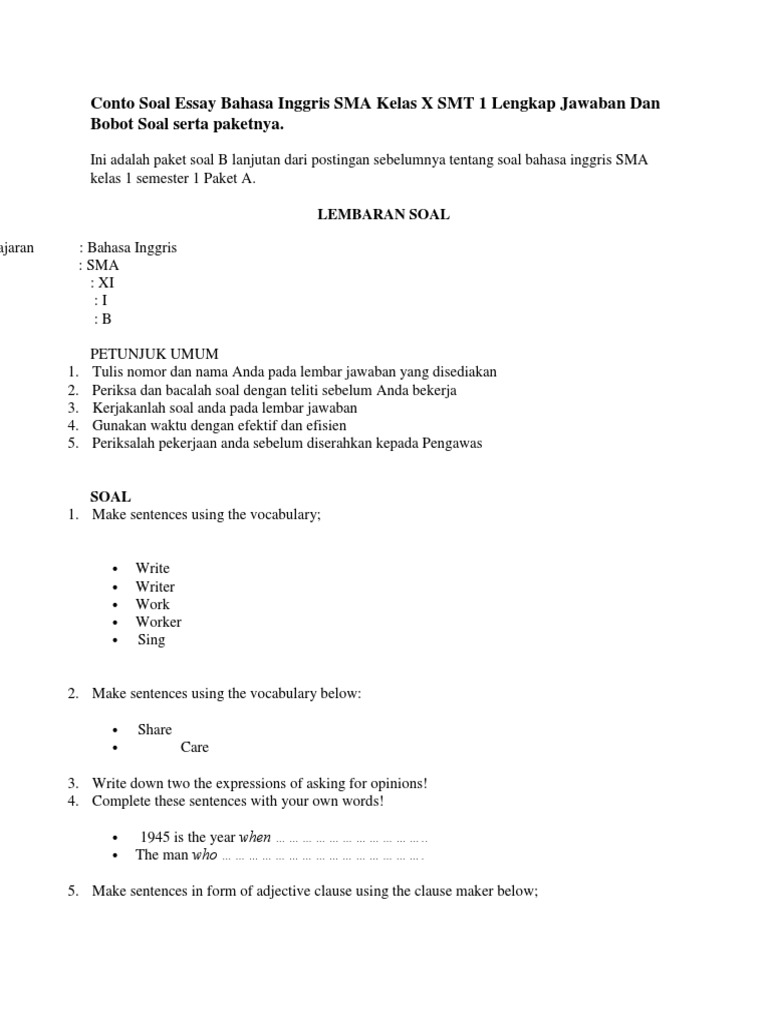 Soal Essay Bahasa Inggris Tentang Lagu from electivelypaige.com Soal essay descriptive text kelas 10. We did not find results for: Check spelling or type a new query. Maybe you would like to learn more about one of these?